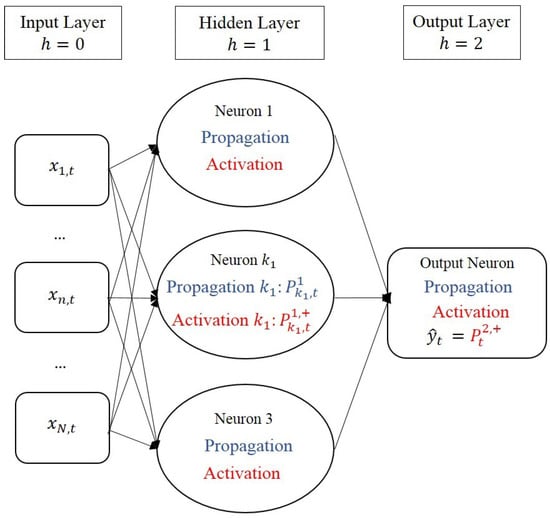 The training of a feed-forward supervised neural network starts with forward-feeding. Forward-feeding works in the direction input layer - hidden layer - output layer on the training dataset (see, e.g., []). In this step, at each neuron of the hidden layer and the output layer, propagation functions and activation functions are applied as follows:
