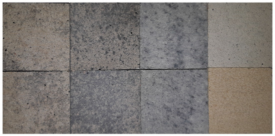 Precast concrete pavements were made with Portland cement CEM I 52.5 R according to the European standard for common cements, grey or white, depending on the final color of the sample. Siliceous and calcareous sand (0–2 mm) was used. The calcareous sand was marble powder. Table 2 collects the code and main characteristics of all the tested precast concrete pavements. They were made with different Portland cements and aggregates.