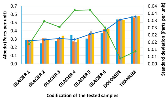 Solar reflectance is often measured in terms of albedo, and Figure 2 shows the four individual results considered in this work for each sample to calculate the average albedo, Rm. It should be stressed that the standard deviation for the samples with the highest albedo values (dolomite and titanium) was the lowest.