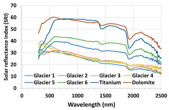 Figure 3 shows the solar reflectance index (SRI) as a function of the wavelength. Dolomite and titanium samples present a maximum SRI between 50 and 60 in the range between 500 and 1500 nm, whereas there was a downward trend in the samples with the lowest albedo (from 30–35 to 20) in the same range of wavelengths.