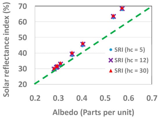 There is a linear correlation between the solar reflectance index (SRI) and albedo. Figure 4 shows the marked correlation between the SRI and albedo. As the trend line shows, there is a significant correlation between the two. The following Equations (6)–(8) show the strong correlation (R2 > 0.999).