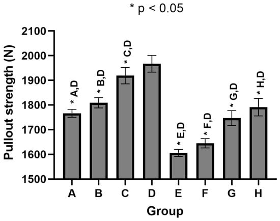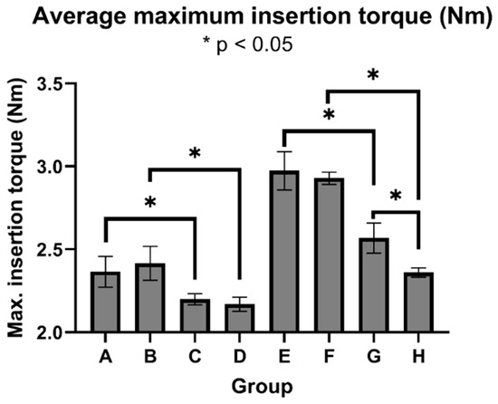 | Group | Average Insertion Torque (Nm) during Initial Screw Revolutions | Average Max. Insertion Torque (Nm) | STD | Average Pullout Strength (N) | STD | |||