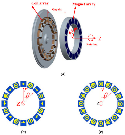 A three-dimensional structure is proposed in Figure 1. Sixteen magnets were arranged in two ways to form two magnet array rings (a Halbach array and a two-directional array). Four cubic magnets were arranged in each group, and the Halbach array was composed of four groups. The magnetization directions of the four magnets in each group were specific. The magnetization direction of eight magnets in the two-directional array is the Z axis, and the magnetization direction of the other eight magnets is opposite to the Z axis. The coil face of the magnet array was fixed on the stator. The magnet array is the rotating part. The stator and the rotor had the same axis. A change in the magnetic flux in the coil results in the generation of induced voltage when the magnet array rotates.