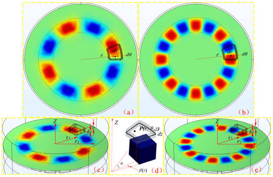 Dynamic state of an energy harvester with multiple parameters: (a) top view of the magnets and coil with the Halbach array; (b) top view of the two-directional magnet array and coil; (c) three-dimensional view of the magnets and coil with the Halbach array in a dynamic response state; (d) three-dimensional view of cylindrical coordinates; (e) three-dimensional view of the magnets and coil with the two-directional array in a dynamic response state.