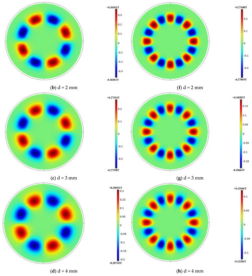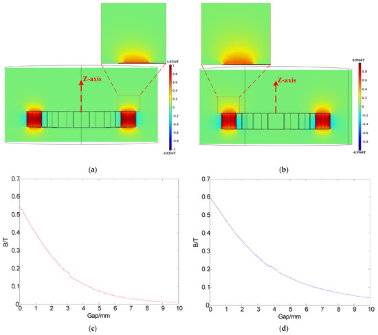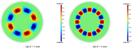 A comparison of the magnetic flux density under different gaps between the Halbach array and the two-directional array is shown in Table 1. As the gap diameter increases, the magnetic flux density of the Halbach array decreases more slowly than that of the two-directional magnet array. The maximum magnetic flux density of the Halbach array is almost 2 times the maximum magnetic flux density of the two-directional array when the gap diameter is 5 mm. The difference in magnetic flux density at the magnetic poles of the two magnet arrays decreases as the gap diameter decreases. The maximum magnetic flux density of the two-directional array is close to the maximum magnetic flux density of the Halbach array when the gap diameter reaches 1 mm. Figure 4a,b show that the magnetic flux density at the poles of the two-directional array gradually approaches the magnetic flux density at the poles of the Halbach array when the gap diameter approaches 0. The magnetic flux density at the poles of the Halbach array is higher than that of the two-directional array at the same gap diameter. Figure 4c,d show the magnetic flux density versus the gap diameter at the poles of the two magnet arrays.