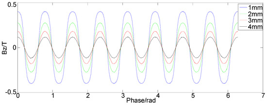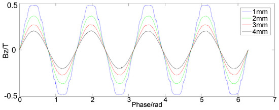 Figure 3a–d present the magnetic flux density of the Halbach array at four different gaps. The maximum magnetic flux density decreases as the gap increases. The maximum magnetic flux density at a gap of 1 mm, 2 mm, 3 mm, and 4 mm is 0.48277 T, 0.36561 T, 0.27524 T, and 0.20551 T, respectively.