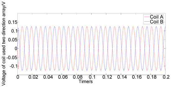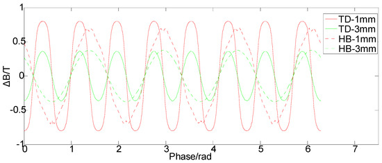 ΔB, the difference in magnetic flux density, was calculated from the magnetic flux density at the junction of the coil and the selected arc, which had a radius of 21.5 mm. The calculated ΔB also changed periodically with the rotation of the coil. As Figure 7 shows, the peak value of the calculated ΔB by the two-directional array is larger than that of the Halbach array when the gap diameter is 1 mm. The peak value of the calculated ΔB by the Halbach array is larger than that of the two-directional array when gap diameter is 3 mm. The magnetic flux difference ΔB reflects the change in magnetic flux and also affects the induced voltage directly.