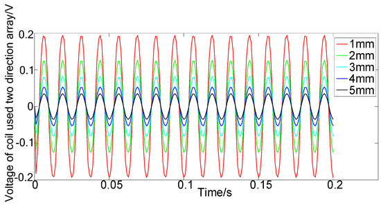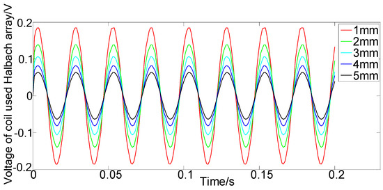 The periodic curve of induced voltage versus time in the coil of the REMEH with the Halbach array is shown in Figure 8. When the gap between the coil and the magnet array increases, the amplitude of the induced voltage decreases, while the frequency and period of the induced voltage remain unchanged. The decrease in magnetic induction as the gap increases is the reason for the decrease in the induced voltage in the coil.