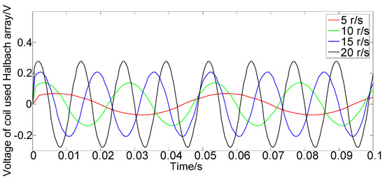 Induced voltage in the coil of the REMEH with the Halbach array versus time under different rotation speeds when the gap is 2 mm.