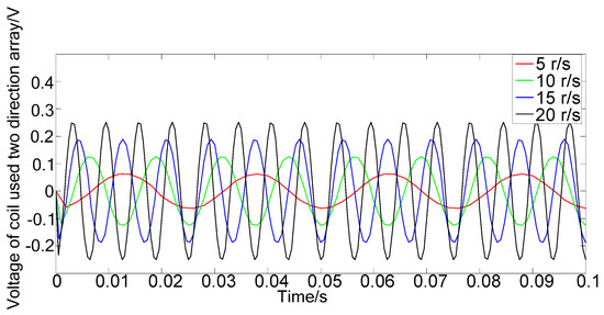 Different rotation speeds result in different amplitudes and frequencies of the periodic induced voltage under the same gap diameter. The induced voltage’s amplitude doubles and the frequency doubles when the speed is increased from 5 r/s to 10 r/s, as is shown in Figure 10 and Figure 11.