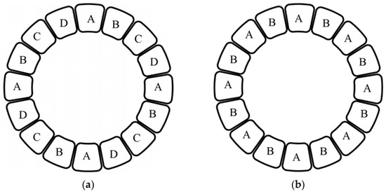 Four phases of the induced voltage in the coil of the REMEH with the Halbach array and two phases of the induced voltage in the coil of the REMEH with the two-directional array. The number of turns of each coil in the calculation is 50. (a) REMEH with the Halbach array; (b) REMEH with the two-directional magnet array.
