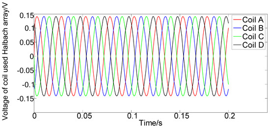 The induced voltage in the coil of the REMEH using the Halbach array exhibits four different phases under the same gap diameter and rotation speed, as shown in Figure 12 and Figure 13. The different initial positions of the coil caused four different voltage phases. The amplitude, frequency, and RMS value of the voltage in each coil are the same.