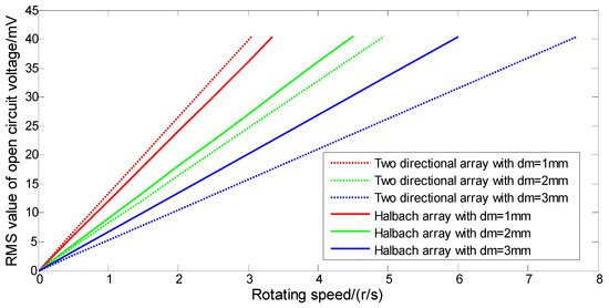 RMS value of the induced voltage of the REMEH with the two-directional magnet array and the REMEH with the Halbach array versus rotation speed at different gap diameters.