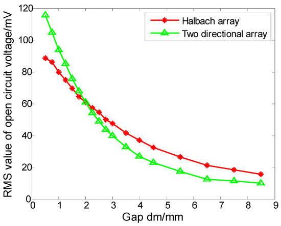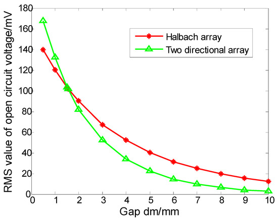 As shown in Figure 16, the RMS value of the induced voltage in the coil decreases as the gap between the magnet and the coil increases. The RMS value of the voltage in the coil of the REMEH using the Halbach array decreases more slowly than the RMS value of the voltage in the coil of the REMEH using the two-directional array. When the gap reaches 10 mm, the RMS value of the voltage in the coil of the REMEH with the two-directional magnet array is almost zero while the RMS value of the voltage in the coil of the REMEH with the Halbach array remains considerable. The RMS value of the voltage in the coil of the REMEH formed by the two-directional magnet array or the Halbach array is same when the gap is 1.55 mm. The two-directional array has better performance in energy harvesting than the Halbach array when the gap is less than 1.55 mm. The Halbach array has better performance in energy harvesting than the two-directional array only when the gap is greater than 1.55 mm.