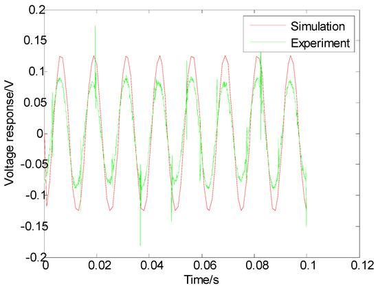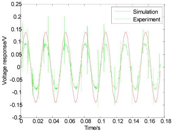 The simulation voltage response and the experimental voltage response were compared when the rotating speed was fixed. As Figure 19 and Figure 20 show, the measured peak-to-peak values are slightly lower than the simulation results. The frequency of the simulated voltage is consistent with the frequency of the experimental voltage.