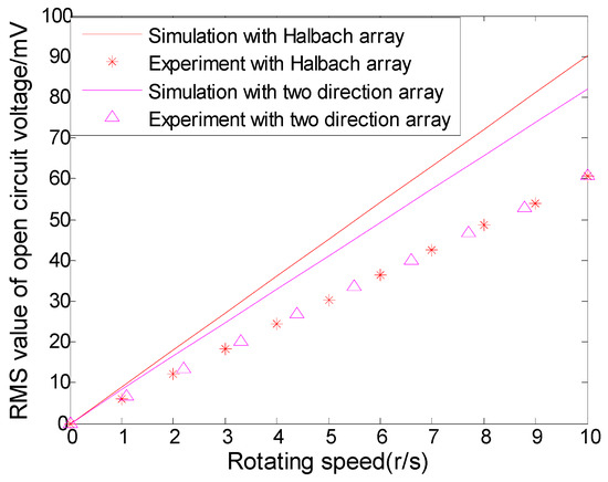 The experimental data and the simulation data were compared at certain rotation speeds and the results are depicted in Figure 21. The RMS value of the induced voltage has a linear relationship with the rotation speed when the distance between the magnet and the coil is 2 mm. The RMS value of the induced voltage in the coil was the same when either of the two magnet arrays was applied in the REMEH.