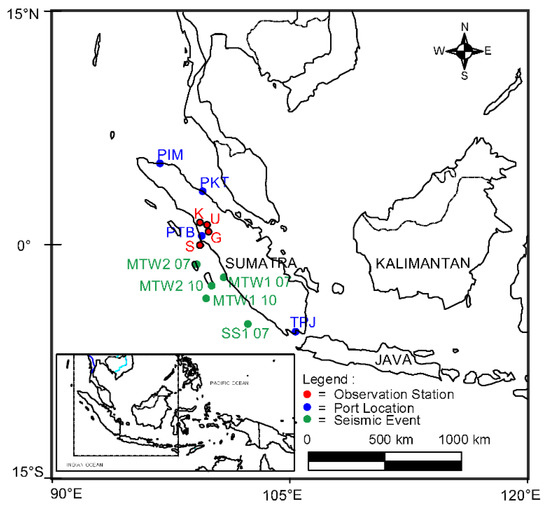 Indonesia is an earthquake-prone country, and Sumatra is one of its high-seismicity regions. The seismic activity in Sumatra is characterized by two geological features: the Sunda megathrust, which is an inter-plate subduction zone between the Indo-Australian and Eurasian plates, and the Sumatra fault zone that divides Sumatra into two parts [1]. Indonesia’s infrastructure (e.g., port facilities) has been damaged by earthquakes, such as the Sumatra–Andaman Islands earthquake in 2004 [2], the South Sumatra earthquake in 2007 [3], the West Sumatra earthquake in 2009 [4], and the Mentawai earthquake in 2010 [5]. Port facilities are installed on soft soils in coastal areas; therefore, they are vulnerable to earthquakes. Earthquakes that occurred in other areas, such as the 1995 Kobe earthquake [6], the 1999 Kocaeli earthquake [7], and the 2020 Samos earthquake [8], also caused severe damage to port facilities and led to the stagnation of the social economy.