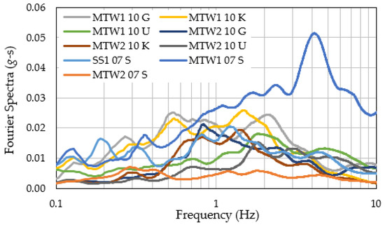 The observed EGM records contained two horizontal component records. To make the most of the limited number of EGM records, the two horizontal components were treated independently in this study. As a result, the number of EGM records was 18. Before the seismic response analysis was conducted, baseline correction was first performed, and the EGM records were tapered. Figure 2 shows the Fourier spectra of the east–west direction component of the EGMs. The Fourier spectra of MTW 1 07 S showed large amplitudes in the frequency range higher than 1 Hz because its peak ground acceleration of 0.12 g was higher than those of the other EGMs (0.015–0.04 g). Predominant frequencies covered a wide range, from 0.5 to 4 Hz, showing that EGMs with varying frequency characteristics were provided.