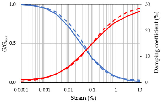 A frequency domain seismic response analysis that considered nonlinear soil characteristics was performed to evaluate the EGM incidents in the bedrock using the EGM records at the ground surface (deconvolution). For the shear modulus and the damping coefficient dependencies on the shear strain, we referred to Seed and Idriis [26] for sandy soil and Vucetic and Dobry [27] for cohesive soil. Figure 3 illustrates the nonlinear soil characteristics considered in this study. The dashed line expresses the sandy soil characteristics. The solid line denotes those of the cohesive soil. The blue line shows the shear modulus normalized by the initial value (G/Gmax), while the red line depicts the damping coefficient. DEEPSOIL software [28] was used for the analysis.