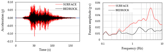 The collected ground data only provided the unit weight and the N-values obtained by the standard penetration test. The S-wave velocity of each soil layer was calculated using the correlation equation proposed by Imai and Tonouchi [29]. Table 3 shows the soil conditions of the Sikuai Island station as an example. For this site, the hard clay silt of the sixth layer was treated as the bedrock. Figure 4 shows the time history and the Fourier spectrum of the EGM at the ground surface and the bedrock with reference to the east–west direction component of MTW1 07 S. The predominant amplitude of 4 Hz in the EGM on the ground surface was due to the shallow subsurface; thus, the predominant frequency in the EGM incident in the bedrock was unclear.