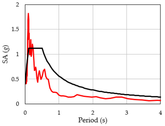 Next, the PGA of the EGM incident in the bedrock was matched to that of the SNI at the very dense soil site of site class SC. The matched PGA was 0.40 g. Figure 5 shows the SA referring to the east–west direction component of MTW1 07 S (red line), which is compared with the SA of the SNI for site class SC (black line). In this case, the SA of the bedrock in a very short period range was larger than that of the SNI, but the SA was smaller than that of the SNI in the period band of 0.3 s or longer. The amplitudes of the individual SAs are different from that of the SA of the SNI. Regarding the SA shown in Figure 5, the large SA of MTW1 07 S in the very short period range is attributed to the comparatively large Fourier amplitude in the high-frequency range of the bedrock EGM shown in Figure 4.
