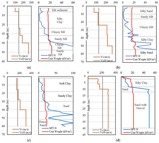 This study targeted four port sites in Sumatra: the Pupuk Iskandar Muda Jetty (PIM), Tarahan Powerplant Jetty (TPJ), Port of Teluk Bayur (PTB), and the Port of Kuala Tanjung (PKT) (Figure 1). Two boring data per site, which provided a total of eight data, were collected. Figure 6 shows four soil profiles. The S-wave velocities were evaluated from the N-values in a manner similar to that described in the previous section. The depths of the bedrock varied from −10 to −50 m. Only the PIM belonged to the SD site class. The other three sites were classified under the SE site class. This meant that most of the site classes of the port sites in Indonesia are classified as SE.