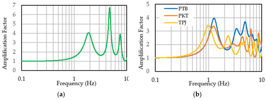 Figure 7 illustrates the transfer functions for the target locations. The transfer function of site class SD (PIM) showed a predominant frequency of 1.92 Hz with an amplification factor of 4.03. The predominant frequencies at site class SE ranged from 0.96 to 1.26 Hz, depicting smaller values compared to the value at site class SD. The peak amplitudes at the predominant frequencies ranged from 3.36 to 3.94. Note that the transfer functions were calculated using the initial shear modulus of the soil (i.e., before an earthquake). Using the 18 EGM incidents in the bedrock and the 8 shallow subsurface data, the 144 EGMs on the ground surfaces were calculated by a seismic response analysis that considered the nonlinear soil characteristics. The numbers of EGMs for site classes SD and SE were 38 and 106, respectively.
