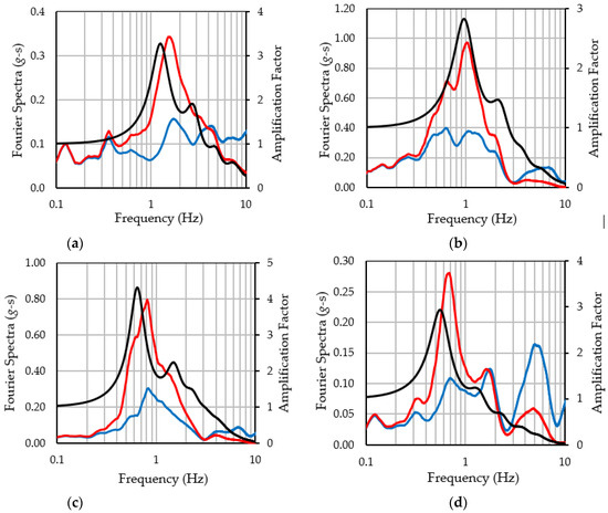 Figure 10 illustrates the Fourier spectrum of the EGM incidents (blue line), the transfer function by the shallow subsurface (black line), and the Fourier spectra of EGMs at the ground surface (red line). In cases where the SA became very large, the predominant frequencies of the EGM incidents in the bedrock agreed with those of the transfer functions, resulting in large SAs at specific period bands. In cases where the SA became very small, in addition to the fact that the Fourier spectra of the EGM incidents were small, the two predominant frequencies did not agree, resulting in small SAs.