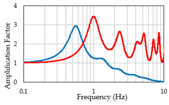The SA variation was very large; thus, site-specific EGMs for seismic design must be set using individual ground conditions by methods such as those shown in this study. However, in many cases, the ground data at sites of interest were not obtained in detail. In such cases, the degree of coincidence between the natural period of the port facilities and that of the shallow subsurfaces must be assessed. Attention must be paid to the decrease in the shear rigidity of soft soils during massive earthquakes because it results in an increase in the natural period of the shallow subsurface. Figure 11 shows a comparison of the transfer functions before an earthquake (red line) and during earthquake (blue line) at the points shown in Figure 9a. The natural frequency decreased from the initial value of 1.28 to 0.92 Hz during an earthquake. The SA became very large when the natural period of the port facilities coincided with that of the shallow subsurface.