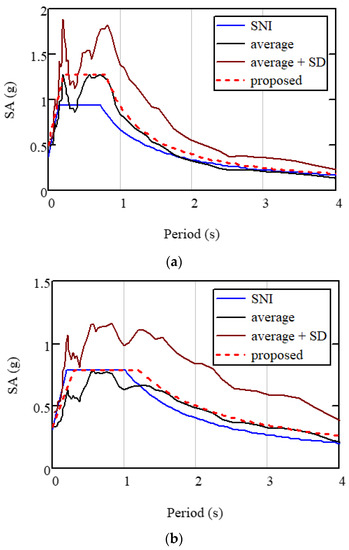 Figure 12 illustrates the proposed SAs (red dashed line) with the average SAs (black line), average + SD SAs (brown line), and SAs of the SNI (blue line) for each site class. Table 4 also presents the proposed SAs.