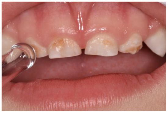 Lesions start as whitish spots on the buccal surfaces of maxillary incisors (mild ECC) that may progress into cavitated defects involving also maxillary molars (moderate ECC) and mandibular teeth (severe ECC), leading to root stumps in the most critical cases [2]. Depending on the severity of the pathology, several significant consequences of ECC (pain, infections, etc.) may have a negative impact on a child’s health and quality of life [2,6,7].