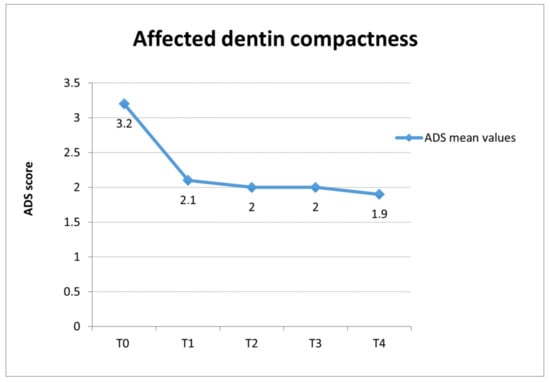 The primary aim of this study was to evaluate whether the in vivo treatment of ECC-affected teeth with ozone therapy was able to improve the decayed dentin’s compactness at T1 (after the ozone therapy cycle) and T2, T3, and T4 (1, 2, and 3-month follow-up) in comparison to T0 (baseline) according to the Affected Dentine Scale (ADS), a clinical scale proposed by the authors.