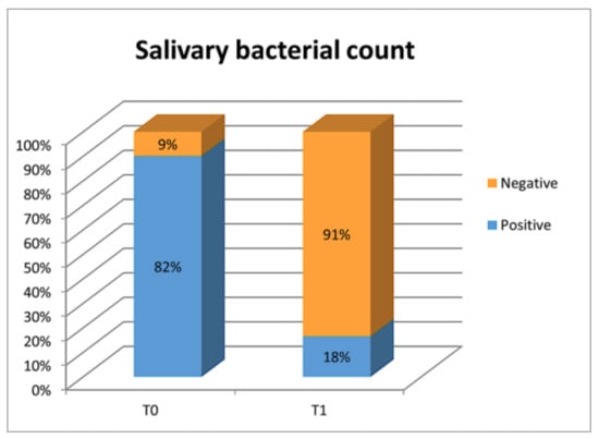 Nine of these 11 tests were positive for Streptococcus Mutans at T0, while two were negative. At T1, the bacteria count decreased significantly according to the McNemar test (p = 0.008): 8 of the 9 patients that were positive at T0 became negative at T1. In contrast, no changes were detected for the negative ones.
