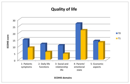 The results of the ECOHIS questionnaire are reported in Figure 4, which illustrates a comparison of the total score of each domain between T0 and T1. The mean ECOHIS score at T0 was 9.4, while that at T1 was 5.9.
