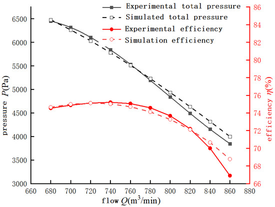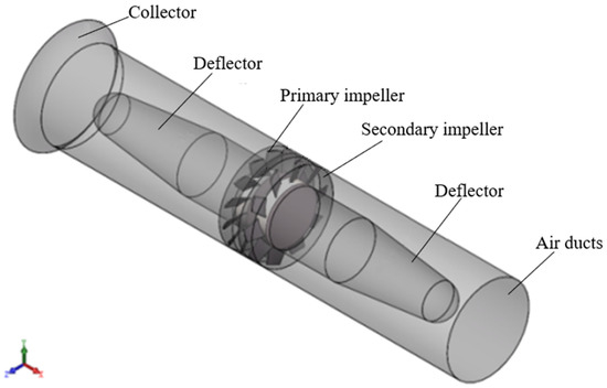 - Boundary condition setting: Define the inlet end face of the collector as the velocity inlet, and the velocity direction was the normal direction of the inlet end face. The turbulence intensity and hydraulic diameter method were selected to control the turbulence; the outlet end face of the air duct was set as a free outlet; define the interface between the two-stage impeller and the air duct area for coupling and data transmission; the two-stage blade and the wall of the hub were set with a rotating wall, and the rotation speed remained relatively static with the region of adjacent cells. The other walls were set as static walls. All walls adopted the wall condition without slippage and considering the surface roughness.