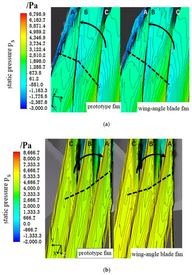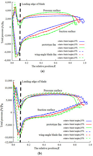 - The pressure distribution on the pressure surface of the secondary blade of the optimal wing angle blade fan is stronger than that of the prototype blade. Additionally, the maximum pressures at blade heights of 25%, 50%, and 75% are increased by 2.3%, 9.3%, and 8.1%, respectively, compared with the prototype blades at the same blade height.