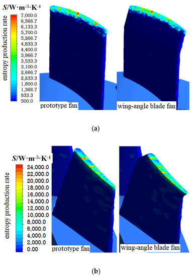 - The angle blade can effectively reduce the generation of shedding vortices at the trailing edge of the blade, and reduce the strength of the shedding vortex, so that the entropy production of the optimal angle blade fan in the orthogonal experiment is reduced by 1.55% compared with the prototype fan.