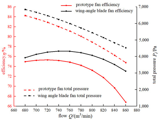 - Compared with the prototype fan, the total pressure and efficiency of the optimal wing angle blade fan are increased by 7.24% and 1.76% at the rated flow, and the total pressure and efficiency are increased by 11.32% and 3.88% on average under the full flow condition.