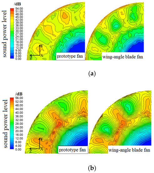 - In the orthogonal experiment, the maximum sound power levels of the first and second blade trailing edge regions of the optimal wing angle blade fan were reduced by 0.17% and 1.62%, respectively, compared with the prototype fan.