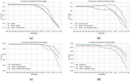 Figure 3a–d show the behavior of TASE when plugged to some of the different WUW classifiers described in Section 3.3. We find that TASE is notably beneficial to models, such as SGRU or cnn-trad-pool2, which present lowest robustness to noise, as compared to ResNet15 or CNN-FAT2019, where TASE yields equal or worse performance at some noise ranges. We hypothesize that ResNet15 and CNN-FAT2019 do not benefit of the speech enhancement as much, since they are bigger and more complex architectures that already handle the nuances of noise with more precision. However, an exhaustive fine-tuning of hyperparameters has not been done for every architecture, as we have prioritized covering more models, instead of deeply fine-tuning a few ones, due to computational restrictions. Therefore, we do not discard that our default hyperparameter choice might be biased toward certain architectures, yielding worse performances for cases, such as the TASE-E2E in ResNet15. Detailed metrics for SGRU and cnn-trad-pool2 can be found in Table A1 and Table A2.