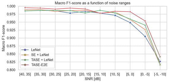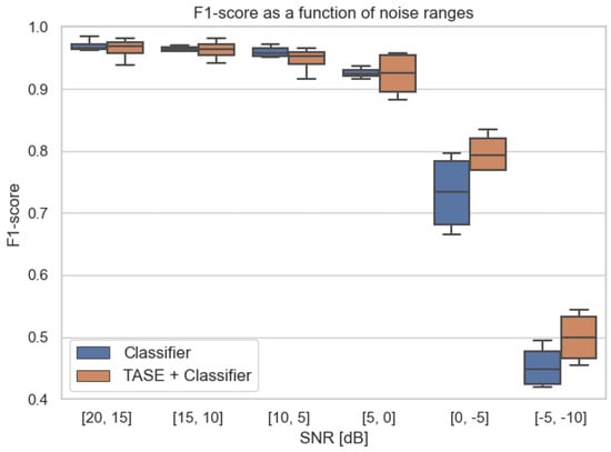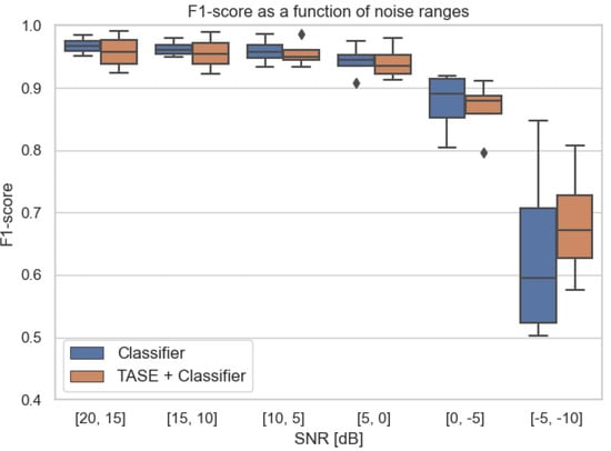 Nonetheless, in the case when the classifiers are trained with a wider SNR range ( dB SNR) by data augmentation, the performance gap between using TASE or not using is significantly reduced. F1-scores between both choices are on par for most of the SNR ranges. The noisiest range of dB SNR shows a small advantage for the model with respect to TASE, but it is not as large as the averaged improvement reported in Figure 4; see Figure 5.