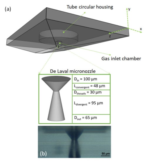 After the irradiation, the sample was immersed in an ultrasonic bath of a 20% HF aqueous solution for 80 min to completely reveal the desired empty inner volumes. For the present work, we designed a De Laval micronozzle with the final geometric characteristics reported in the blow-up of Figure 1a,b. This device represents an example of the FLICE capabilities for the fabrication of micronozzles. Indeed, we can choose any arbitrary diameter, shape, and length for the different sections of the nozzle, considering a minimum lateral dimension of 10 µm due to HF etching selectivity [,,].