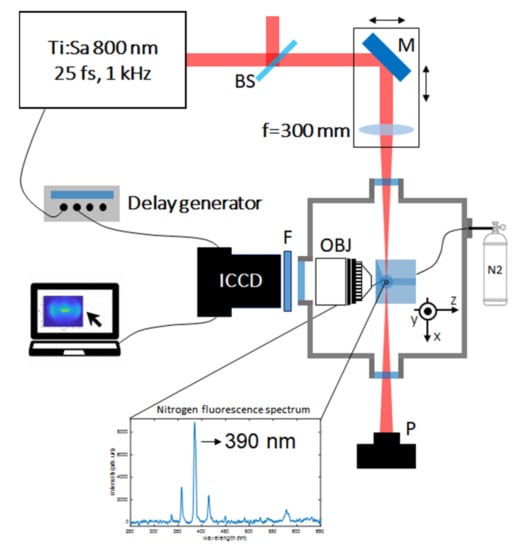 The spectrum emitted by nitrogen filaments in the visible down to the UV was preliminarily measured in air; a strong emission line from N2+ at 391 nm was detected. This spectral component was selected by using a 5-nm bandwidth interferometric filter at 391 nm (Thorlabs) placed at the entrance of the ICCD.