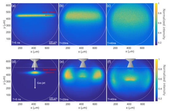 The high nitrogen density in the focused jet produces a local increase of fluorescence intensity. At T = 5 ns, the signal intensity is enhanced by almost two orders of magnitude compared to the fluorescence of the filament in vacuum (Figure 3a). In particular, the intensity on the peak is higher by a factor of 76 as compared to the intensity along the plasma filament. In Figure 3d, the fluorescence emitted along the whole filament is not visible as in Figure 3a, since the camera gain was tuned for acquiring the bright emission form the gas-jet volume.