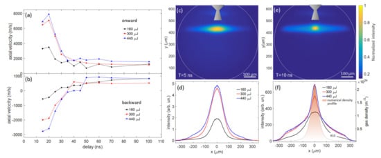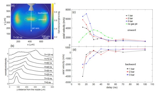 To quantify the plume expansion dynamics, we determined the position of the two peaks from the intensity profiles and estimated the propagation velocity, as provided in Figure 4c,d. Both the two wavefronts experienced a fast transitory regime, during which the propagation velocity reached values up to 7 × 103 m/s and 5 × 103 m/s for the onwards and the backward components, respectively. The velocity peak ranged between 15 ns and 20 ns from the pulsed excitation. At longer delays, the velocity converges towards a steady value. Compared to the unperturbed filament (green curve in Figure 4c), plasma generation in a gas flux produced both faster expansion dynamics and higher propagation velocities. In this framework, we explored the dependence of both the onward and the backward shock wave components on the gas flux by changing the nitrogen backing pressure. Upon increasing the backing pressure, the onward component underwent an increase of the expansion velocity. On the other hand, the increasing directional force opposed by the gas-jet on the propagation of the backward component produces a slower transitory response and a lower peak expansion velocity. This pressure dependence mainly affected the initial expansion dynamics by 40 ns, up to the dissipation of the thermodynamic forces driving the plasma expansion.