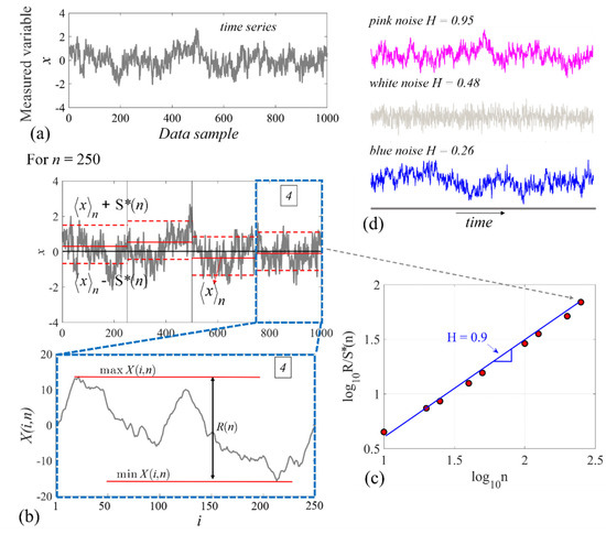 - Calculate the local range as the maximum fluctuation of the sum of the deviation from the mean, where and are the maximum and minimum values of , respectively, and (Figure 3b).
