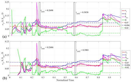 - For both applications, the DFA parameter that was calculated for the whole dataset was inconclusive. However, when considered separately, the low () and high () state levels indicated a critical region where one converged to extreme anti-persistent correlations, and the other, to extreme persistent ones. That highlights these parameters’ usefulness in indicating the criticality of the structure.