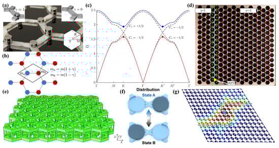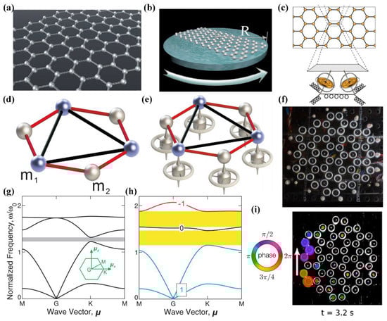 In the same year, Nash et al. experimentally and theoretically demonstrated that a coupled system of gyroscopes could generate topological states [57]. The honeycomb lattices consisting of gyroscope–spring networks are shown in Figure 1c, and the experimental system is shown in Figure 1f. The experimental system consists of 54 coupling gyroscopes on a honeycomb lattice; the gyroscopes are composed of small dc motors spinning cylindrical masses, which are coupled by placing a small neodymium magnet in each mass with its moment aligned vertically. The time-reversal symmetry could be broken by controlling the spinning gyroscopes and the geometry of the lattice. As expected, robust and topologically protected one-way waveguides were observed in the experiment, as shown in Figure 1i.