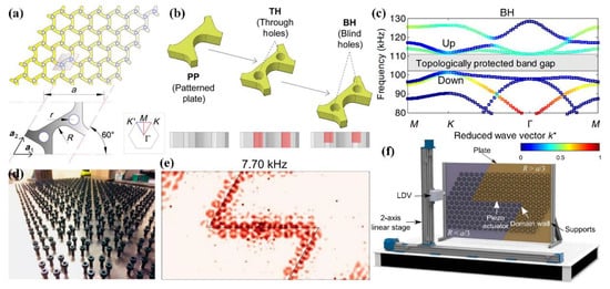 In 2015, Mousavi et al. numerically demonstrated elastic-wave analogs of the QSHE with a dual-scale phononic slab [60]. Inspired by this work, Miniaci et al. experimentally investigated the topologically protected helical edge modes via elastic plates, e.g., the sample in Ref. [60] in 2018 [61]. The patterned plate (PP) which resemblesthe twisted Kagome lattice geometrically [83] and the unit cell, are shown in Figure 2a. The perspective and cross-sectional view of the unit cells are shown in Figure 2b. By introducing circular through holes (THs) in the PP, the accidental fourfold degeneracy of two Dirac cones emerges at the K point. Furthermore, replacing THs with blind holes (BHs), the through-the-thickness symmetry is broken, which resembles spin orbital coupling and lifts the degeneracy at K point, as shown in Figure 2c The manufacturing pattern plate used for the experiment is divided into two parts by a Z-shaped interface with BHs drilled on the opposite (top or bottom) surfaces. As expected, the topologically protected Z-shaped interface supports helical edge modes.
