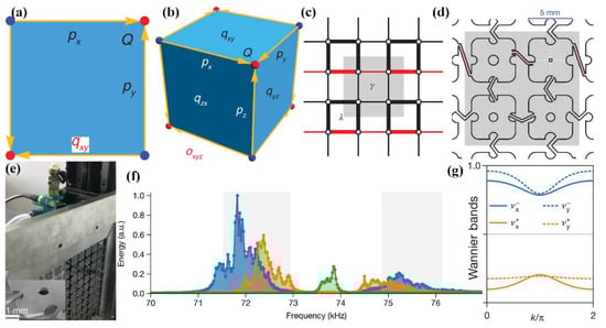 In 2018, Serra-Garcia et al. proposed a mechanical configuration to realize a quadrupole topological insulator [105]. A tight-binding model with positive and negative couplings is shown in Figure 4c. The unit cell and experimental photo of the setup are, respectively, shown in Figure 4d,e. The quantized quadrupole TIs can be realized by manipulating the positive or negative couplings and the amplitudes of the intracell or intercell couplings. Specifically, the amplitudes of the intracell hoppings or intercell hoppings are controlled by the distance between the given beam and the nodal line, and the positive or negative hoppings depend on which sides of the nodal lines are connected by the beams. The amplitudes of the intracell or intercell hoppings controlling the emergence of the bandgap between two pairs of degenerate bands. The positive or negative couplings emulate a magnetic flux per plaquette. The gapped edge states and in-gap corner states appear at the single plate for . The corresponding spectrum is shown in Figure 4f. Here, two pivotal features of the quantized quadrupole phase should be focused on. The first feature is that the response is located at around 72.92 kHz and 74.89 kHz, which represents the gapped edge modes. The second feature is that there are strong corner resonances in the middle of the gap, which is indicative of the in-gap corner states. To further confirm the TIs is quadrupole, the Wannier bands are calculated as shown in Figure 4g. The bulk-induced edge polarization could be calculated using the eigenvectors of the Wilson loops since the Wannier bands and are gapped. The value of the polarizations are , which suggest the existence of in-gap states.